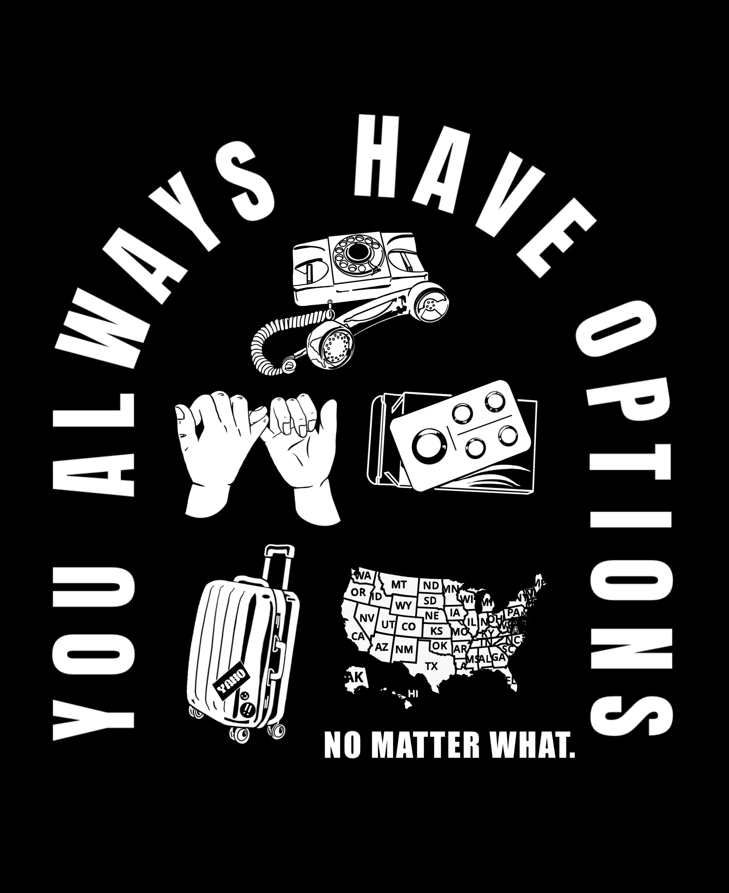 YAHO is both a phrase and a website. The website is a hub for top-level abortion resources in the US. At the YAHO site, people can find information on clinics, pills, legal and medical information, and more. The phrase is easy to remember and share. In a time of fear and lack of information around abortion, we also intend “You Always Have Options” to be a beacon of hope for people seeking abortions and those who support abortion access.